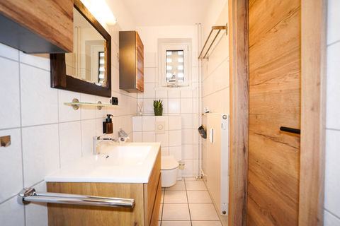 Unser Tageslicht Badezimmer ist mit Dusche, einem Waschbecken und einer Toilette ausgestattet.